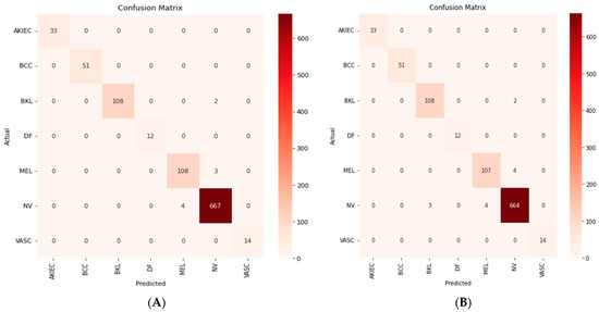 Confusion matrix of the proposed ensemble model (A) and the baseline EfficientNetV2S model (B).