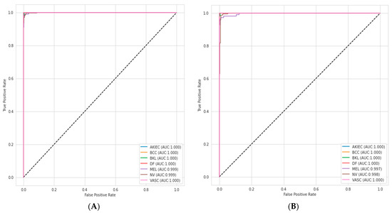 The relationship between the sensitivity and FP rate for different threshold settings is known as the receiver operating characteristics (ROC) curve. The ability of a classification model is tested using the area under the curve (AUC), which is the area under this ROC curve. The performance improves with area size. The ensemble model achieved a higher ROC–AUC score than EfficientNetV2S for multi-class skin disease problems as shown in Figure 9.