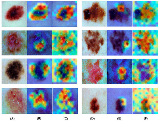 (A–D) are the real images (B–E) visualization of our baseline EfficientNetV2S model (C–F) visualization of our ensemble model (EficientNetV2S + Swin-Transformer model).