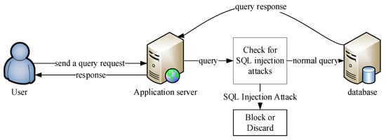 Structured Query Language (SQL) injection is a code injection attack that executes the input data as code, thus violating the data-code separation principle []. An attacker can insert SQL commands into the query string of a web form submission, Uniform Resource Locator (URL), or page request and change the SQL statement execution logic to gain access to resources or change data stored in the database when a web application is passing SQL statements to the backend database for database operations without strict filtering of user input parameters, as shown in Figure 1.