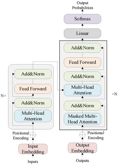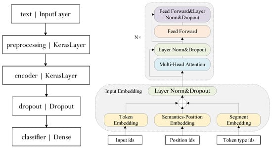 It is well known that Bidirectional Encoder Representations from Transformers (BERT) are used for pre-training to learn word vector representations of specific words in a given context. BERT uses the encoder part (left of Figure 3) of the transformer architecture []. Its most important feature is that it discards traditional RNNs and CNNs and effectively solves the tricky long-term dependency problem by transforming the distance of two words at arbitrary positions through an attention mechanism.