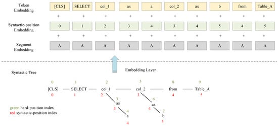 In this paper, the original position embedding is changed to a semantically relevant position embedding, i.e., the semantic information of the SQL statement is embedded explicitly in the input layer. Figure 4 visually represents how we replace the original position embedding with a custom embedding.