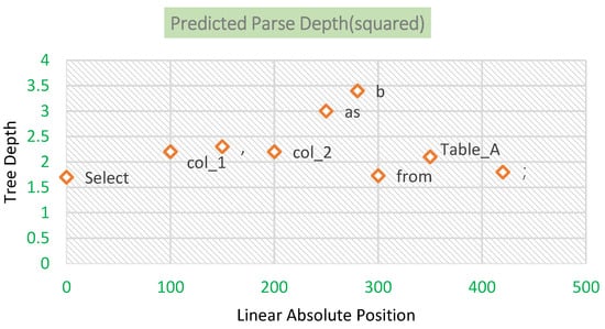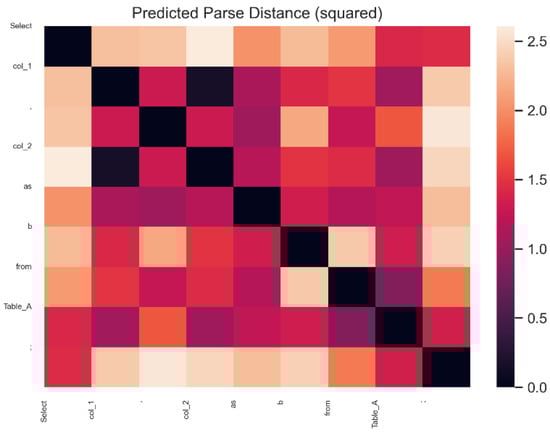 Taking the statement “Select col_1, col_2 as b from Table_A;” (Note: Table_A here is the table name of the example, not a chart in this paper) as an example, the visualization of the parsing depth and parsing distance obtained using the structure probe is shown in Figure 6. It can be seen that the results are generally similar to those of the SQL parser: “b” has the deepest depth in the syntax tree, followed by “as”; “col_2” is similar to “col_1”; “Table_A” is deeper than “from”. The heat map of the predicted parsing L2 distances is shown in Figure 7.