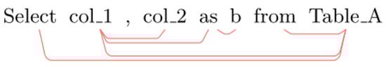 | |- 0 DML ‘Select’ |- 1 Whitespace ‘ ’‘ |- 2 IdentifierList ‘col_1,… ‘ |- 0 Identifier ‘col_1’ | `- 0 Name ‘col_1’ |- 1 Punctuation ‘,’ |- 2 Whitespace ‘ ’ | `- 3 Identifier ‘col_2,…’ |- 0 Name ‘col_2’ |- 1 Whitespace ‘ ’ |- 2 Keyword ‘as’ |- 3 Whitespace ‘ ’ | `- 4 Identifier ‘b’ | `- 0 Name ‘b’ |- 3 Whitespace ‘ ’ |- 4 Keyword ‘from’ |- 5 Whitespace ‘ ’ |- 6 Identifier ‘DT_A’ | `- 0 Name ‘ DT_A’ `- 7 Punctuation ‘;’  |