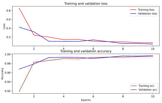 By adjusting some hyperparameters to make the model perform better and plotting the accuracy and loss curves with epochs for the training and validation sets. It can be seen from Figure 9 that the loss function of the model converges to an accuracy of about 0.9974 and a loss of about 0.0371, and reaches an accuracy of 0.9973 and an F1 score of 0.9964 on the validation set. We will then compare the methods with those of other papers.