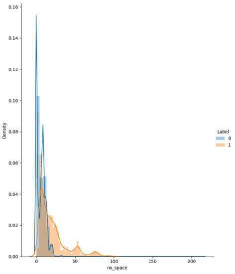 The distribution of feature 8. The horizontal coordinate indicates the number of spaces in the SQL query, and the vertical coordinate indicates the corresponding probability density function. The blue line indicates benign samples and the orange line indicates malicious samples. As can be seen, queries with the number of spaces after 25 have a high probability of becoming malicious.