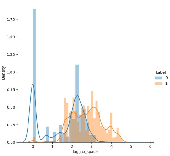 Log-transformed distribution of feature 8. The horizontal coordinate indicates the logarithm of the number of spaces in the SQL query, and the vertical coordinate indicates the corresponding probability density function. The blue line indicates benign samples and the orange line indicates malicious samples. As can be seen, this distribution is not a perfect Gaussian distribution and there is a lot of overlap between the two categories.