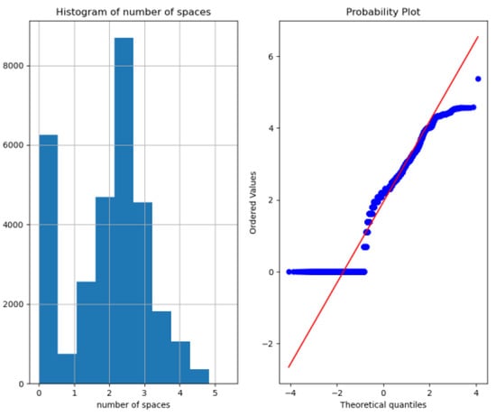 Q-Q plot of feature 8 by log transformation. After doing Box-Cox transformation on the distribution of the number of spaces, the sample frequency histogram (left) and Q-Q plot (right) are plotted. In the Q-Q plot (right), the horizontal coordinate indicates the normal distribution quantile and the vertical coordinate indicates the data quantile. It is obvious that the feature of the number of spaces does not follow a normal distribution.
