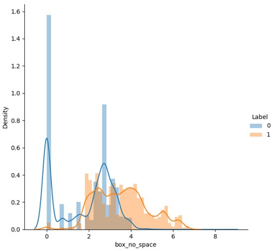 Distribution map of feature 8 after Box-Cox transformation. The horizontal coordinate indicates the Box-Cox transformation of the number of spaces in the queries, and the vertical coordinate indicates the corresponding probability density function. The blue line indicates benign samples and the orange line indicates malicious samples. It can be seen that there is still plenty of overlap between the two categories.