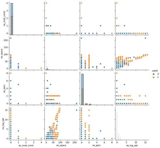 By plotting the relationship between individual features and labels, we check whether the feature contributes to the prediction output. Distribution, box-line, violin, and Q-Q plots of log-transformed distributions and Box-Cox-transformed Q-Q plots are plotted, respectively. The features with higher discrimination, i.e., 3 to 17, are selected. As shown in Figure 10, Figure 11, Figure 12 and Figure 13, the distribution and Q-Q plots on feature 8, it can be seen that the query has a high probability of becoming a positive sample as the number of spaces increases to 25 afterward. However, neither the log-transformed nor the power-transformed distribution plots show a good Gaussian distribution shape, so the feature is not taken. Furthermore, pairwise plots of the sampled features were plotted, and bivariate analysis was performed to find the range of features that would help distinguish them. Figure 14 shows the paired analysis plot for features 7 to 10. It can be obtained that features 3 and 6, features 5 and 6, features 11 and 15, and features 12 and 15 are the features that help predict the labels. Finally, t-distributed Stochastic Neighbor Embedding(t-SNE) plots are drawn to analyze whether the features work. As in Figure 15, the vast majority of points are well separated.