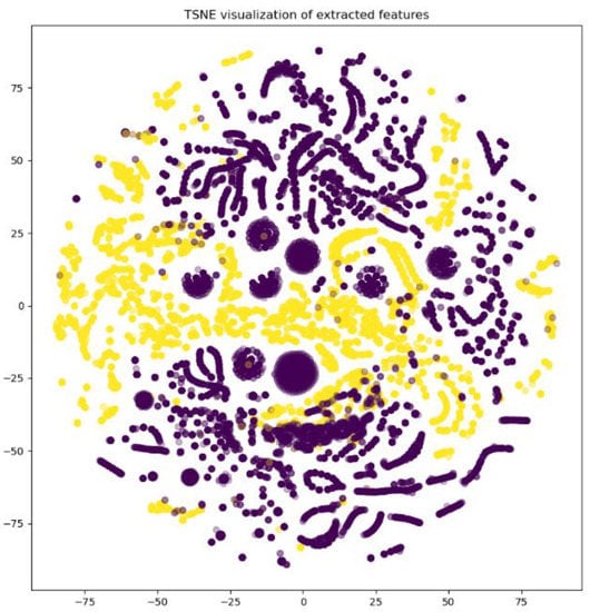 T-SNE dimensionality reduction classification result. The available features selected by the bivariate analysis were used to plot the reduced dimensional t-SNE plot. As can be seen, the vast majority of samples are well separated, indicating that these features are useful.