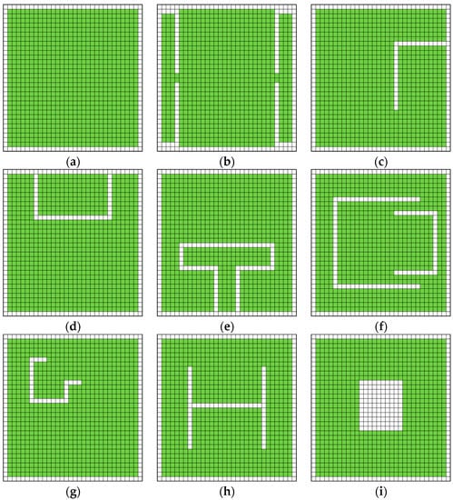 Training geometries of normalized multi-band patches: (a) conventional patch, (b) extended patch, (c) L-slot patch, (d) U-slot patch, (e) T-slot patch, (f) double U-slot patch, (g) G-slot patch, (h) H-slot patch, and (i) square-slot patch. Pixel dimensions: 5 mm × 5 mm. Green: conductive surface; white: uncovered substrate.