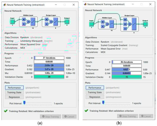 When implementing the network, we used TRAINSCG as a training function, LEARNGND as a learning function, MSE as a performance function, and LOGSIG as an activation function. Training details are given in Figure 4b.