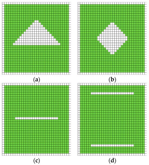 Testing the geometries of normalized multi-band patches: (a) triangle-slot patch, (b) circular slot patch, (c) single notch patch, and (d) double notch patch. Pixel dimensions: 5 mm × 5 mm. Green: conductive surface; white: uncovered substrate.