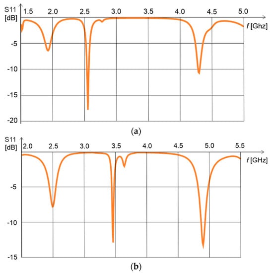 In the numerical model, the patch was completed by a microstrip feeder and a wave port (Figure 6). The antenna was simulated in the frequency range of 1.5 GHz–5.0 GHz. The impedance characteristics (Figure 7a) showed that resonance frequencies are shifted.
