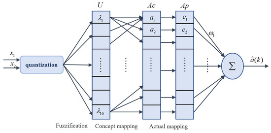 The action network was adopted to approximate the control input . In this study, a fuzzy cerebellar model articulation controller (FCMAC) neural network was used as the approximator, providing a simple and fast approximator [30]. FCMAC requires fewer iterations and provides higher real-time accuracy than a BP network, making it suitable for the online learning problem in this study. The architecture of FCMAC includes input space, variable fuzzification, concept mapping, actual mapping and output space, as shown in Figure 3.