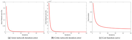 In the simulation, the maximum number of iterations in each RHRL time domain was = 50. The learning rates of the action network and the critic network were gradually reduced sequences ⋯ = 0.3, 0.25, 0.2⋯0.05. The iteration errors of the critic network and the actor network are shown in Figure 6a,b, and the cost function curve is shown in Figure 6c.