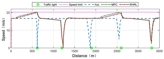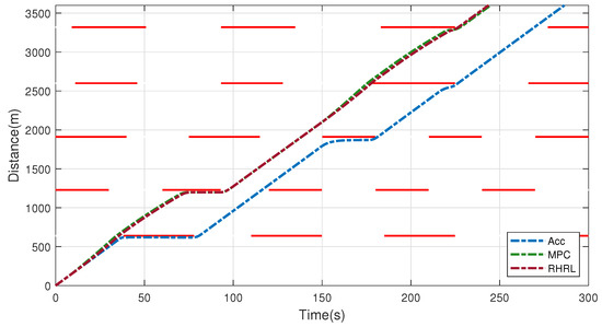 Compared with the rules-based ACC approach, the proposed algorithm and MPC accelerate and decelerate slowly in advance, considering the traffic information. Figure 9 shows the traffic light sequence and speed trajectory at multiple intersections. Meanwhile, the RHRL and MPC save overall driving time while reducing energy. In the acceleration stage, the acceleration of RHRL is relatively slow, which is more conducive to energy saving.
