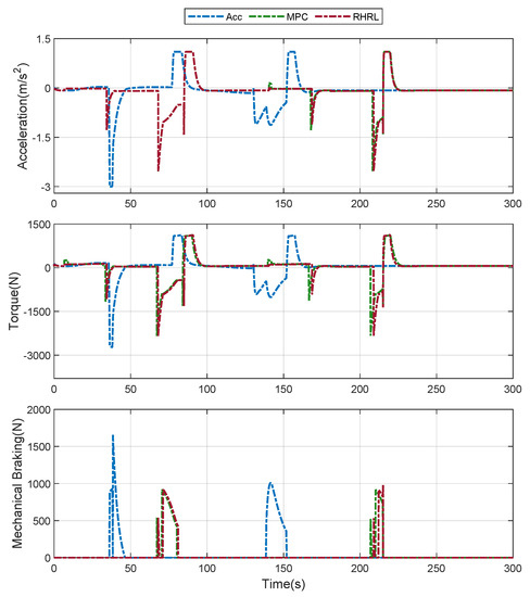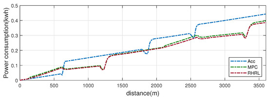 Figure 7 and Figure 8 compare the strategies of the three algorithms regarding the distance domain and time domain, respectively. Compared with the ACC algorithm, the RHRL and MPC were based on the approaching intersection information, and the acceleration or deceleration of a vehicle was determined in advance. For example, MPC and RHRL accelerated the vehicle through the intersections based on advanced calculations according to the time remaining in a green phase at the 150–600 m section and 2100–2950 m section. However, ACC braked and stopped the vehicle at the traffic light. IN the MPC and RHRL control algorithms based on forward road information, the RHRL acceleration was relatively slow, which is more conducive to energy saving. At 1200 m, the vehicle using the three algorithms could not pass the intersection based on the time remaining at the traffic lights. MPC and RHRL adopted the method of idling at a permissible speed to reduce energy consumption. Figure 8 shows that the magnitude of ACC initiating mechanical braking was significantly higher than that of the MPC and RHRL algorithms at 45 s. For EVs, mechanical braking cannot regenerate energy. This means that the more mechanical brakes are activated, the more energy is consumed.