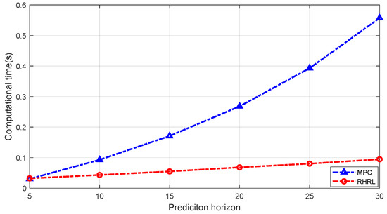 For computational efficiency, a receding horizon framework was adopted in this paper. In each prediction horizon, the complexity of the NMPC optimized by IPM is . The complexity of the method proposed in this paper is . Meanwhile, during the RHRL optimization process, the maximum number of iterations is set. When the total number of iterations is reached, the current strategy optimization is stopped and output is performed. This can be used to obtain suboptimal policies that balance computational efficiency and optimization effect. The computational time used in different prediction horizons is shown in Figure 10. The MPC algorithm increases the computational time with the increase in prediction horizon, which means that it is limited by the chip’s ability during engineering applications. However, the advantages of the RHRL algorithm in terms of computational performance become increasingly significant as the prediction horizon increases. As shown in Figure 10, when the prediction horizon length is 30, the calculation time of the MPC algorithm is about five times that of the RHRL algorithm. Therefore, the RHRL algorithm is more beneficial for engineering applications.