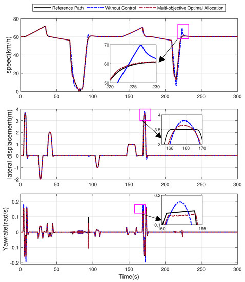 Without the control method, torque equalization occurs. The speed tracking curve shows that the error in the strategy without control significantly increases, and the upper-level demand eco-driving velocity cannot be tracked at 220–230 s. However, the multi-objective optimal allocation has a good tracking effect. From the lateral displacement and yaw rate tracking simulation diagrams, it can be seen that the strategy proposed in this study has a better control effect under acceleration and lane-changing conditions.