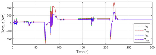 Through the above equation, the real-time display solution of the motor torque can be obtained. The vehicle reduces energy consumption while ensuring safety. Meanwhile, if one motor fails, the control algorithm can be reassigned by changing the G matrix in Equation (33) to achieve system reconstruction and effectively improve the vehicle’s stability in emergency situations.