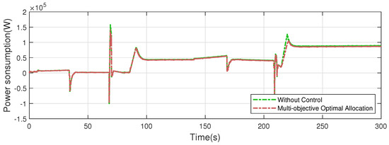 The torque allocation of the four motors is shown in Figure 12. The multi-objective optimal allocation method was used to adjust the motors to work in the high-efficiency area, effectively reducing the motor energy consumption. The two front motors always exert larger driving torques than the two rear motors, reducing the overall power consumption. Instantaneous power consumption is shown in Figure 13. The multi-objective optimal allocation method consumes less energy than the strategy without control.