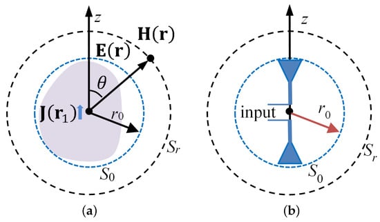 The coefficients and in (2)–(5) are determined by the sources in enclosed by . k is the wavenumber and is the intrinsic impedance in free space. represents the spatial phase shift. is the spherical Hankel function of the second kind. We use the notation for throughout this paper. The spherical coordinate r, and are defined in their usual way, and their unit vectors are respectively denoted by , , and . It is understood that the expressions may be slightly different in the constant of each term in different studies.