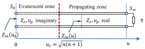 Based on these observations, we can develop the equivalent NTL model for , as shown in Figure 3. In general situations, the NTL consists of two parts divided by the cutoff phase shift . The end port is perfectly matched with . Intuitively, the mode fields enter the input port , travel through an evanescent zone from to , pass the cutoff line, then enter the propagating zone, and propagate from to . In the evanescent zone, the fields decay approximately exponentially. In the propagating zone, the fields may also decrease much faster than at the region near to because of strong local reflections. Only when u is much larger than , the fields begin to propagate like a spherical wave with amplitude decreasing approximately in the order of .