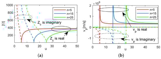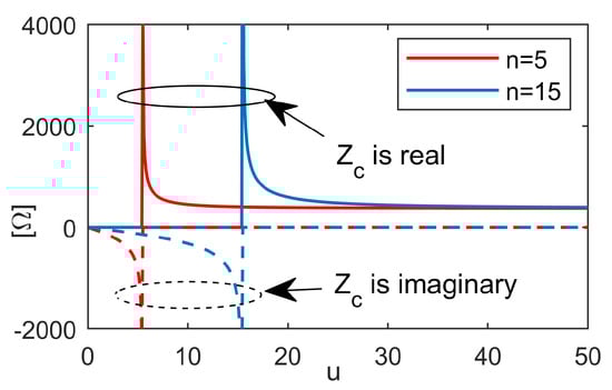 - For , the characteristic impedance and the phase velocity are all real. It is an ordinary transmission line. The voltage and current signals will propagate on the line. However, the line is not a uniform transmission line (UTL) but an NTL. Generally, an NTL can be approximately considered as a section-wise-uniform transmission line, i.e., cascaded by short UTL sections with different characteristic impedances. Therefore, local reflections inevitably occur [24,25].