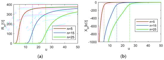 The generalized input impedance of mode for , and 25 are plotted in Figure 6, where the dashed lines indicate the cutoff phase shift for the corresponding mode. As shown in Figure 6a, the input resistances decrease rapidly with when , which clearly reveals that the radiation of a mode is weak in this region. On the other hand, a mode has a very large negative reactance in the evanescent region, which means that it is capacitive and electric energy may be stored in that region.