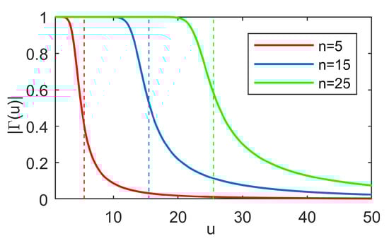 The parameters of mode with , and 25 are plotted in Figure 4, where the cutoff phase shift are respectively 5.48, 15.49, and 25.495. It can be seen that, at a fixed input port , the mode with larger n may experience longer evanescent zone and suffer from larger attenuation. It is required to excite larger fields at to send the same amount of radiation power to . In other words, it is generally less efficient to excite modes with larger degrees.