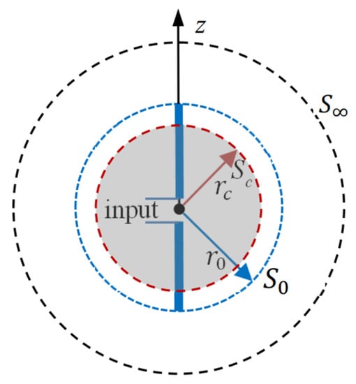 Intuitively, we have two basic methods to improve the radiation efficiency. The first one is to efficiently guide the electromagnetic power outside the cutoff region using some kind of metal structure. A typical structure is the half wavelength dipole shown in Figure 10. Its end reaches with , which is apparently locating in the propagating region of the mode. Because of the two metal arms of the dipole, spherical TEM mode can exist within . The transmission of the spherical TEM mode can be modeled using a UTL with cutoff radius of [23], corresponding to the spherical mode with degree of . It has the potential to efficiently transfer electromagnetic power from the feeding point to . Biconical antennas are also a kind of well-used structures for this purpose.