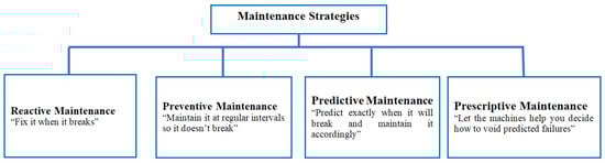 The major goal of maintenance is to minimize malfunctions and maintain the functionality of the system. Maintenance aims to cut down failures that may happen during regular equipment operation [22]. An unanticipated production delay, decreased efficiency, and occasionally other consequences might result from equipment failure. Reactive, preventive, predictive, and prescriptive maintenance procedures are all combined into effective maintenance [23]. Only when a functional failure is brought on by the function’s deterioration are repairs or replacements considered reactive maintenance. The routine examination, alterations, cleaning, replacement of parts, and component repairs make up preventive maintenance. To evaluate the state of the equipment, predictive maintenance employs nonintrusive testing methods, visual inspection, performance data, and data analysis. Through better design, installation techniques, failure analysis, and scheduling, prescriptive maintenance improves equipment condition and rate of degradation [22]. All maintenance strategies are analytically presented in Figure 1.
