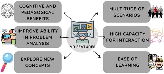 The use of VR has become widespread since the pandemic situation of COVID-19 [12,13,14,15,16,17] because it can be effectively employed to solve or address many of today’s problems such as providing useful learning in engineering [18,19,20,21] and health [22,23,24]. Among the characteristics of VR as a didactic method, the following are worth highlighting (Figure 1): (i) the multiple cognitive and pedagogical benefits, which allow the improvement of students’ understanding of subjects, performance, grades, and the educational experience [25]; (ii) the improvement of students’ ability to analyze problems and explore new concepts [8]; (iii) the multitude of scenarios that can be developed; (iv) the high capacity for interaction [26]; and (v) the ease of learning offered by the technology [8].