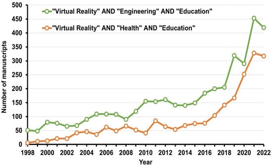 A simple indicator of the growing use of VR in Engineering and Health is the number of research articles that include the term VR as the subject of the research. From a simple SCOPUS query of the number of articles that include in the title, abstract, or keyword (data collected in February 2023) the following search criteria—(i) “Virtual Reality” AND “Engineering” AND “Education”; and (ii) “Virtual Reality” AND “Health” AND “Education”—Figure 2 was obtained. Between 1998 and 2022, a total of 3983 articles in the SCOPUS database include “Virtual Reality” AND “Engineering” AND “Education” in the title, abstract, or keywords. In the case of the search “Virtual Reality” AND “Health” AND “Education”, there were 2197 published articles in the same period.