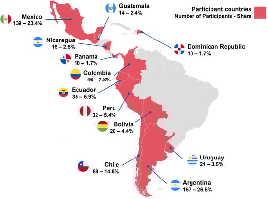 The study involved 606 professors (52.64% females and 47.36% males) from Health Sciences and Engineering degrees from different universities in the Latin American and Caribbean region (Figure 3).