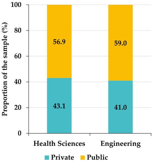 Among the participants, 50.5% (a total of 306) are professors of Health Sciences, while 49.5% (a total of 300) are professors of Engineering. Therefore, the distribution of participants by areas of knowledge is homogeneous (chi-square = 0.06, p-value = 0.8079). Moreover, 42.08% (a total of 255) of the participants work in private universities, compared to 57.92% (a total of 351) who work in public universities, which implies that there is a certain bias in the distribution of the participants by university tenure (chi-square = 15.21, p-value = 0.0001). This slight superiority of the proportion of participants from public universities is realized in the two areas of knowledge analyzed (Figure 4) in an approximately homogeneous way (chi-square = 0.28, p-value = 0.5941).
