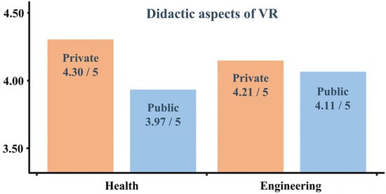 Although no significant differences were identified between the two areas of knowledge in the evaluations of the didactic dimensions of VR, gaps were identified in this regard between public and private universities and, moreover, these gaps do not behave in the same way in one area and the other (Table 6). Specifically, professors from private universities give, in both areas of knowledge, better ratings to VR technologies, both from a technical, usability, and didactic point of view, as well as from the point of view of the future projection attributed to them, than professors from public universities. However, as regards the assessment of didactic aspects, this gap is significantly wider (more than three times wider) among Health Sciences professors than among Engineering professors. In fact, the superiority of the ratings of Health Sciences professors from private universities over those from public universities reaches 8.3%, while among Engineering professors, this gap is only 2.4% (Figure 5).