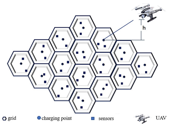 Since the exploration area is large, we divide the exploration area into N grids, and the center point of each grid is used as the charging point of the UAV, and there are J sensors in each grid. The radius of each grid is denoted as a constant , as shown in Figure 1. The UAV only moves between the charging points and hovers over the charging points to collect data from the sensors. To simplify the question, each sensor in this design has collected data, and the packaged data have a length of Z, so the upload time can be expressed as a fixed time slot, denoted as a constant . The sensors with un-uploaded signal will broadcast a signal. The wireless bandwidth of each sensor is orthogonal to each other and the sensors whose data are uploaded will stop broadcasting the signal.
