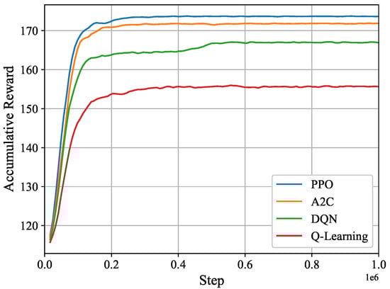 We compare the proposed algorithm with other traditional algorithms, as shown in Figure 2, namely the Q-Learning-based data collection algorithm [26], Deep Q-Network (DQN)-based data collection algorithm and the asynchronous actor–critic (A2C)-based data collection algorithm, as shown in Figure 2. We can see that the Q-learning-based data gathering algorithm has the worst performance because it uses a traditional Q-table. If there are a large number of states and actions, the Q-table that needs to be established will be very large. DQN [27] is an improved algorithm of Q, which uses a neural network to calculate the Q-value and uses the output of the neural network to replace the Q-value. DQN also uses two effective strategies, namely the experience replay and fixed Q-target, to perturb the correlation between experiences and help convergence. The experience buffer will store past transitions. As such, the neural network can use batch learning to randomly extract multiple transitions from the experience buffer in a disordered order and enter the neural network to learn parameters using backpropagation, and thus perturb the correlation between transitions. Fixed Q-targets serve to introduce two neural networks with the same architecture, called eval-net and target-net. This makes the parameter update of target-net happen late, which disturbs the correlation of the data. A2C performs better than Q-Learning and DQN because it introduces the actor–critic framework. It is a synchronous, deterministic variant of the asynchronous advantage actor–critic (A3C) [28]. However, none of them perform as well as the PPO algorithm. This proves the superior performance of our proposed scheme.