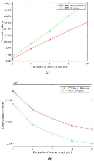 System performance with the number of sensors in each grid. (a) System delay with the number of sensors in each grid; and (b) Energy efficiency with the number of sensors in each grid.