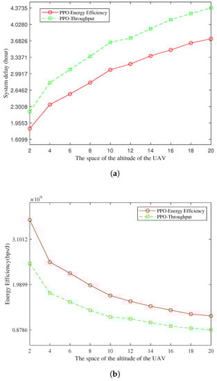 According to Figure 4a, the system delay will decrease with the increase in the altitude space of the UAV. The increases in the amount of information that the UAV can receive inevitably leads to the increase in the delay of the UAV system. According to Figure 4b, the energy efficiency of the system decreases with the increase in the height space of the UAV. The reason is the same as the reduction in the system energy efficiency in Figure 3b. It can be concluded that increasing the hovering height space of the UAV has a similar effect as increasing the sensor density. Increasing the hovering height space of the unmanned aerial vehicle (UAV) differently affects the quantity of data that will be gradually along collected as the increase in the height of the unmanned aerial vehicle (UAV) space is reduced, while the latter can guarantee the linear increase in the amount of data collection, and the increase in UAVs hovering height of PPO in space. Through the time delay of the performance, the energy efficiency performances of the two algorithms have a more significant effect. However, additional sensors are not required, so it is more economical.