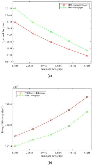 System performance with minimum throughput: (a) System delay with minimum throughput; and (b) Energy efficiency with minimum throughput.