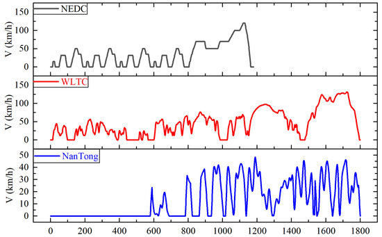 - The average running speed of buses in Nantong city is low, the idle time ratio is high and the maximum speed is low. Compared with NEDC and WLTC, the average running speed, the maximum speed and the idle time ratio of buses in Nantong city are significantly different, with the average relative error reaching 71.53% and 85.37%, respectively. The comparison results show that WLTC driving conditions are difficult to accurately reflect the actual traffic conditions of buses in Nantong city. In order to develop better energy management strategies and vehicle emission standards, it is necessary to consider the influence of regional differences and construct representative driving conditions in line with the actual local driving conditions.