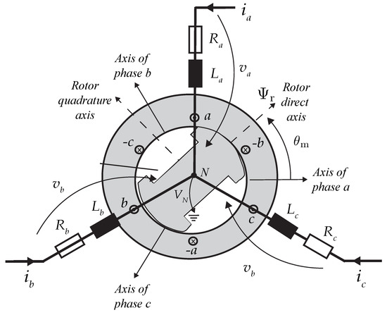 where ,, are the synchronous motor stator self-inductances, ,, are the synchronous motor stator mutual-inductances, and ,, are the flux linkages caused by the rotor magnetic flux in each of the stator’s windings. Again and with reference to Figure 3, the voltage at each of the synchronous motor terminals taking into account the voltage at the star point of the machine () can be written as [23]: