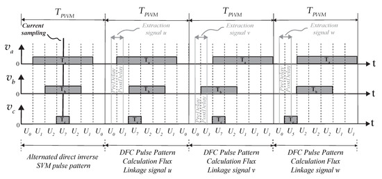From (12), it can be seen that the flux linkage u only depends on the DC-Link voltage and the stator self-inductances that vary with the rotor electrical angle as stated in (8)–(10). Furthermore, in (12), the term is regarded as the offset of the extracted flux linkage u. Due to the fact that the DC-Link voltage is not exactly constant, especially when the DC-Link is supplied through a passive diode–rectifier [41], the offset can vary over the time. For this reason, it is advisable to extract all the signals with the same offset in the measurement sequence. This is with the idea in mind to minimize the DC-Link variation impact over the DFC flux linkage signals [30]. However, there are many possibilities to combine the standard vectors to extract the DFC flux linkage signals (i.e., u,v,w), only a few combinations will extract the three DFC flux linkage signals with the same offset. In effect, the easiest way to extract the DFC flux linkage signals with the same offset is using always a zero vector together with , and as consecutive applied vectors: Specifically: