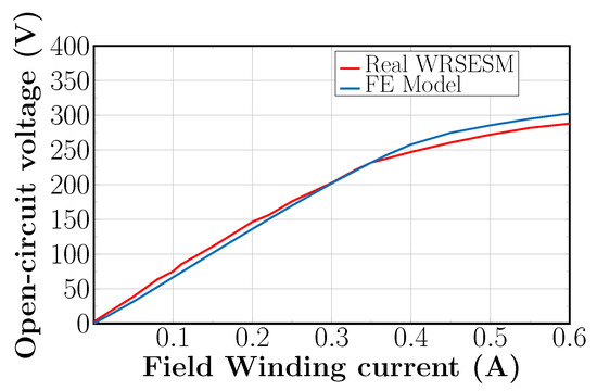 Furthermore, the FE model was validated against the real WRSESM through two different tests, namely the open-circuit test and the short-circuit test. The open-circuit and short-circuit tests were performed according to [40] driving the FE model and the real machine at 1500 RPM and varying the field current from 0 A to its nominal value of 0.6 A. Actually, Figure 9 and Figure 10 show the validation results for the open-circuit test and short-circuit test, respectively. From both figures, it is possible to see that the open-circuit voltages and the short-circuit currents of the FE model closely follow the values measured in the real WRSESM. In particular, the tests’ comparison shows a maximum relative error in the open-circuit test of 7%, and a maximum relative error in the open-circuit test of 5%. However, notice that the mentioned relative errors are valid for field winding currents larger than 0.2 A.
