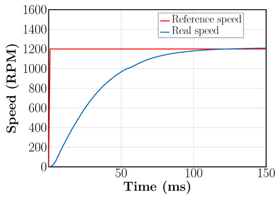 Sensorless speed control for 1200 RPM, speed reference and real speed of the machine.
