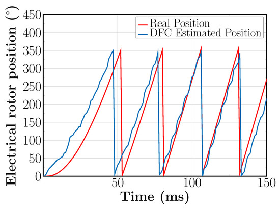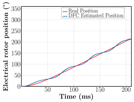 In order to compare the performance of the proposed SVM-based DFC sequence described in Section 2.3 with the original DFC measurement sequence proposed in [27], the model in Figure 11 was simulated using the parameters described in Table 3. For this comparison, we set a speed reference of 1500 RPM for the synchronous machine. On this basis, the rotor position estimated by both methods when the machine reaches its steady state speed of 1500 RPM can be seen in Figure 12. It turns out that the Root Mean Square (RMS) of the position estimation error values is taken as a statistical measure to compare both DFC measurement sequences. Furthermore, Figure 12 shows that, at a speed of 1500 RPM, the modified DFC-based space modulation sequence reaches an RMS error in the rotor position estimation of 11.78°, whereas the original measurement DFC based on SPWM exhibits an RMS error of 28.91° on the rotor position estimation. The DFC measurement sequence based on SVM, which extracts all the DFC flux linkage signals with the same offset and the one proposed in this article, outperforms the original DFC measurement sequence based on SPWM, which extracts the DFC flux linkage signals with a different offset. The latter has already been discussed in Section 2.2 and can be verified resorting to Equations (13)–(15) for the SVM-based DFC measurement sequence, and Equations (16)–(18) for the SPWM-based DFC measurement sequence.